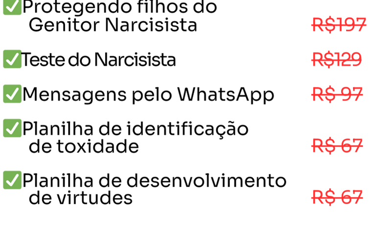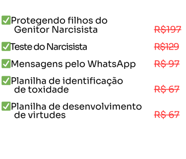 E ainda não acabou. veja tudo que você vai receber no PROTEGENDO FILHOS DO GENITOR NARCISISTA
